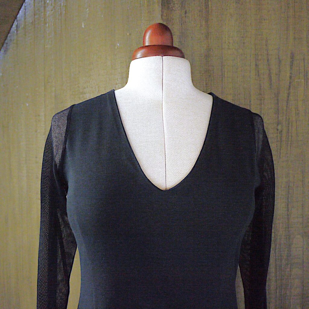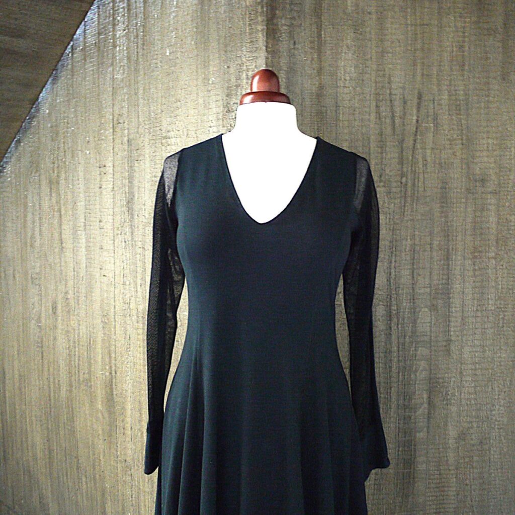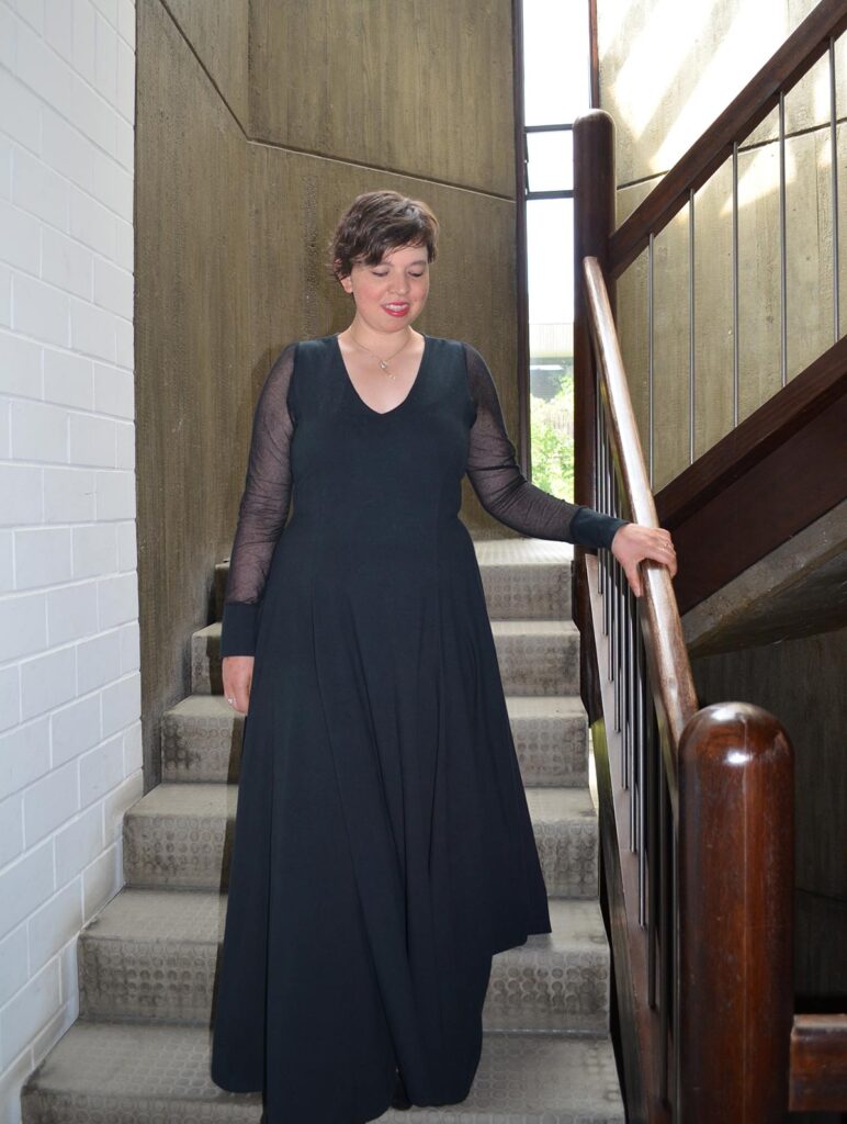 6. April 2025 Kleid mit Tüllärmeln Das schwarze Abendkleid aus Baumwolljersey hat einen V-Ausschnitt und lange Ärmel aus Baumwolltüll. Der Rock öffnet sich glockenförmig und reicht bis zu den Füßen.