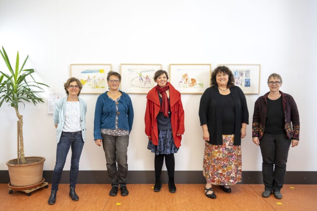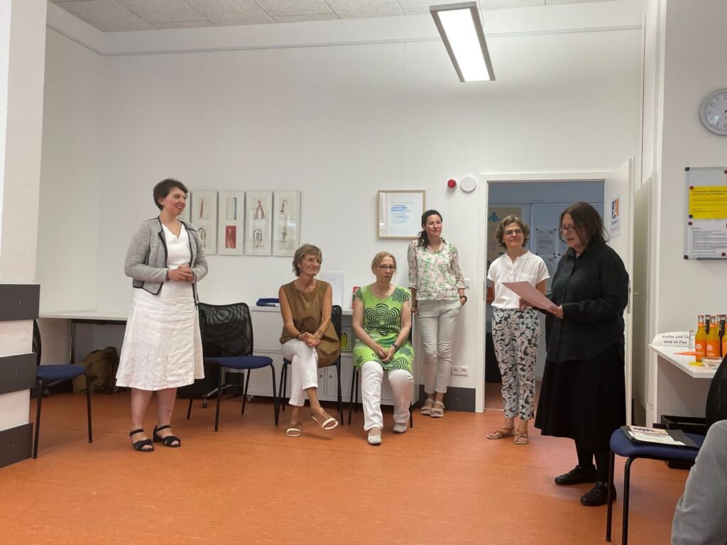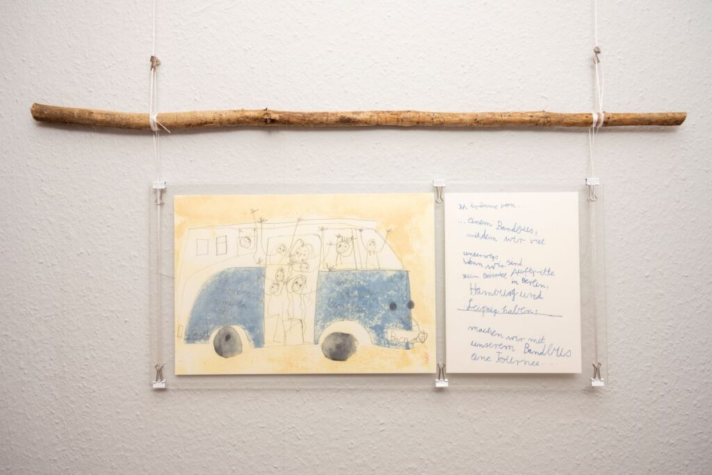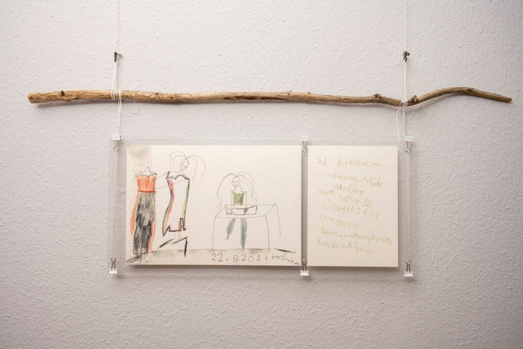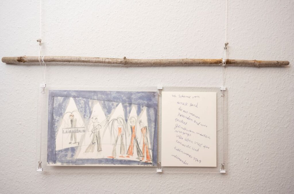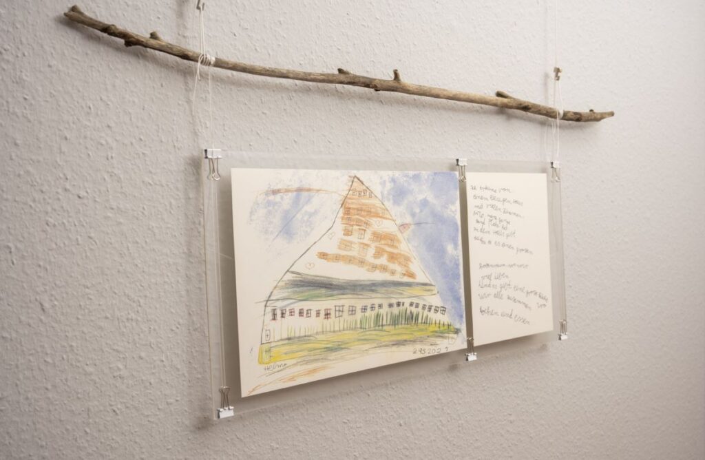 24. April 2023 Oktober 2021 bis Juli 2023: Einzelausstellung in Heidelberg: »Meine Träume« Musik machen mit ihrer Band, mit dem Bandbus unterwegs sein, in einer WG mit den Jungs zusammenwohnen – Helma Striffler malt sich in großformatigen Zeichnungen das Leben aus, von dem sie träumt. Mit dieser Ausstellung wurden die neuen Räume des Selbsthilfebüros der EUTB [Ergänzende Unabhängige Teilhabeberatung] eingeweiht – sie wurde aufgrund der Corona-Pandemie verlängert. Zur Finissage sprach die Stuttgarter Künstlerin Sabina Aurich über »Wirklichkeiten auf der Spur«. Die Fotos hat Felix Becker gemacht. Auszug aus „Aktuelles aus der Region“ Einladung Finissage 2023