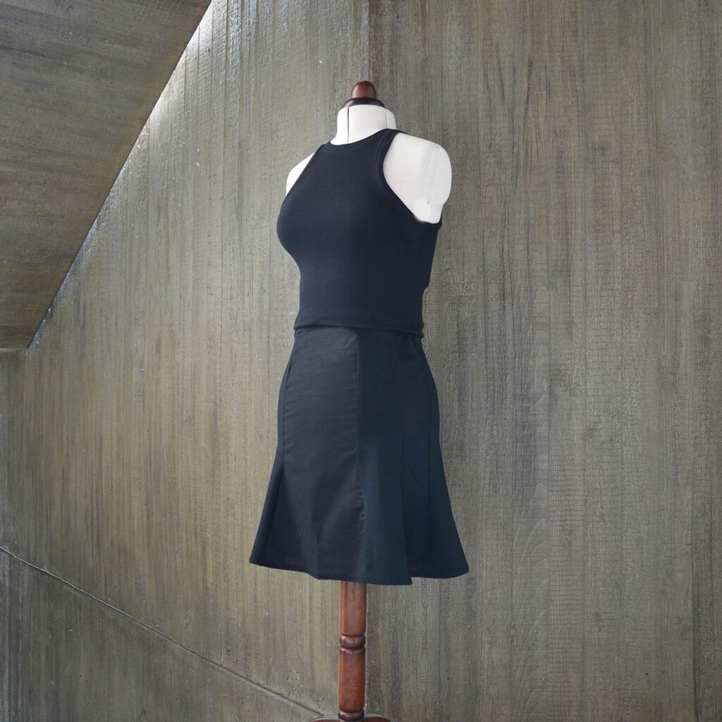 6. März 2025 Acht-Bahnenkleid Das schwarze Kleid mit seinen ausgeschnittenen Schultern und der ausgestellten Unterkante des Acht-Bahnenrocks sorgt für eine anmutige Silhouette. Durch den Wechsel von Baumwolljersey-Bahnen und Bahnen aus feiner Baumwollwebware schmiegt sich das Kleid an den Körper an und es benötigt keinen Reißverschluss.