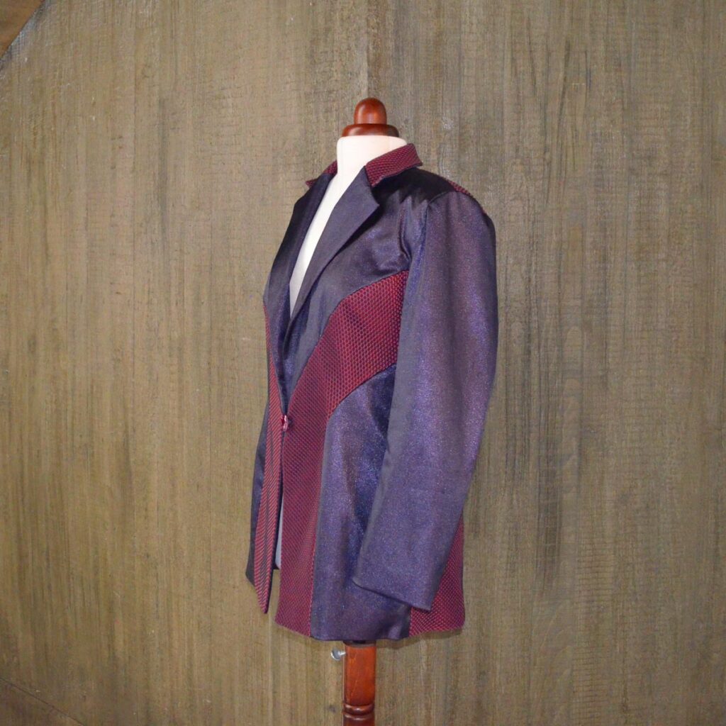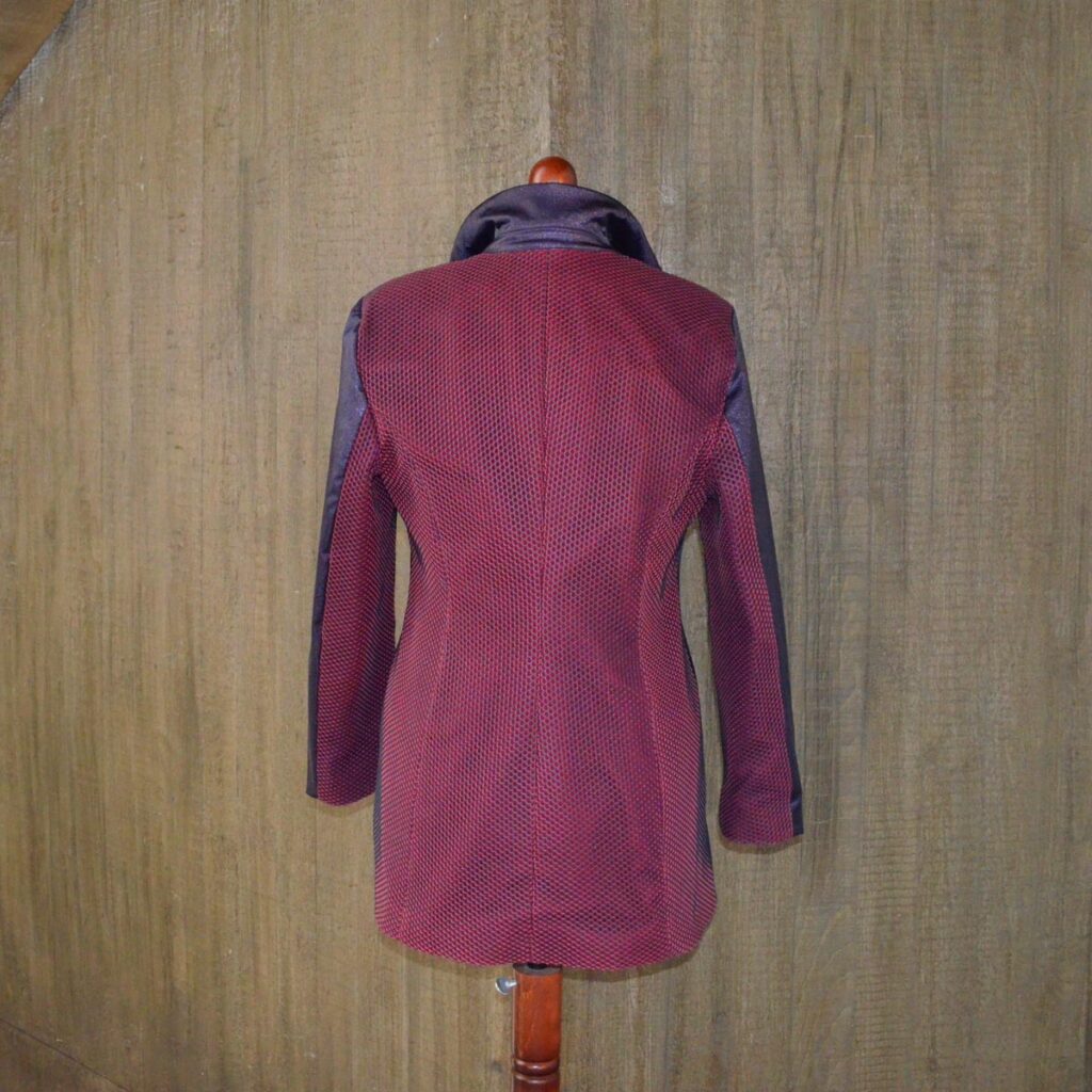 6. April 2025 Blazer mit Schlaghose Der Entwurf des Blazers mit Reverkragen lebt von einer Stoffkombination: Einem glänzenden dunkellila Baumwollmix-Satin und einem zweifarbigen Baumwoll-Netzstrickstoff von Dorothee Schumacher. Der Blazer ist tailliert und lang. Der Schlag der Hose lässt sich mittels eines Reißverschlusses noch einmal vergrößern und gibt an dieser Stelle den zweifarbigen Baumwoll-Netzstrickstoff frei.