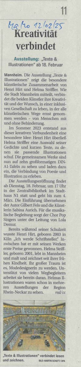 18. Februar 2025 Februar, März 2025 – Ausstellung in der Stadtbibliothek Mannheim Vom 18. Februar bis zum 4. März 2025 zeigte Helma Striffler in der Stadtbibliothek Mannheim zehn Illustrationen, die sie zu Texten von Henri Hirt geschaffen hat, einem Schriftsteller mit Down-Syndrom. Zur Vernissage waren gut 100 Gäste erschienen, eröffnet wurde die Ausstellung von der Künstlerin Sabina Aurich und dem Autor Gilbert Fels. Für die musikalische Begleitung sorgten die Pop Singers unter Leitung von Lola Demur. Einladung zur Vernissage Ausstellung in der Stadtbibliothek MA „Kreativität verbindet“