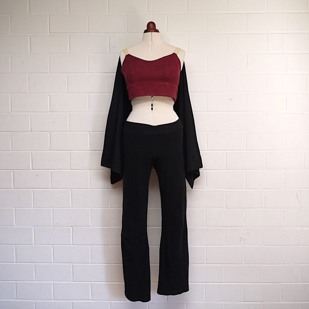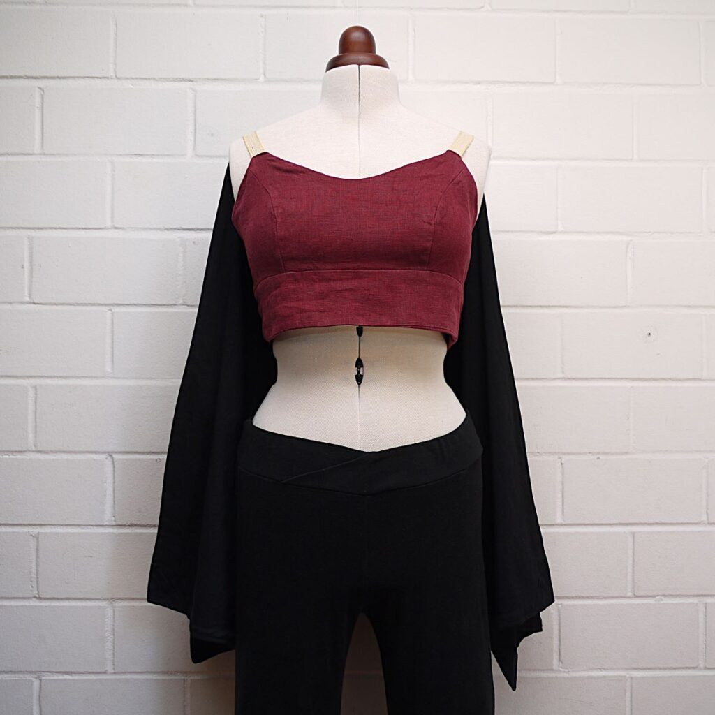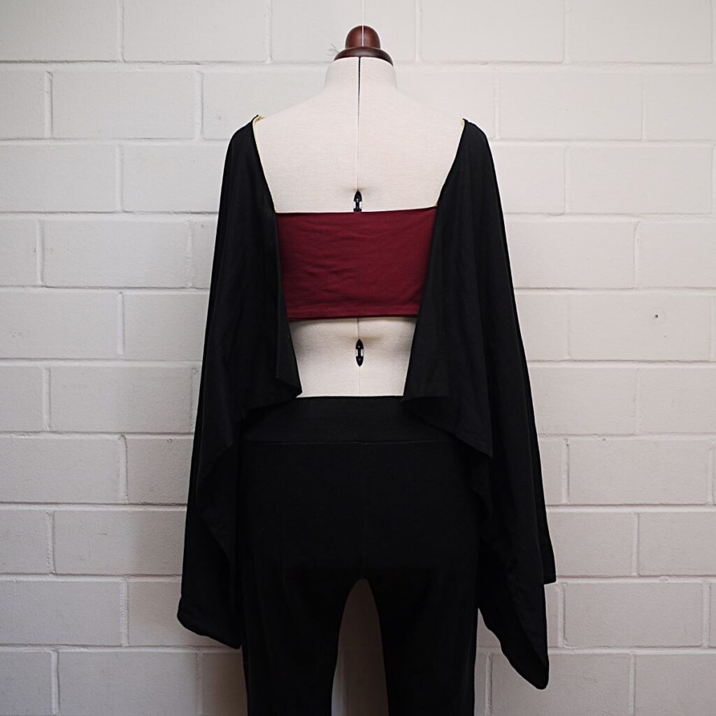 6. April 2025 Outfit mit Flügeln Das rote crop Top aus Leinen ist im Rückenbereich durch Jersey ergänz, um einen besseren Sitz zu gewährleisten. An den gelben Trägern sind zwei schwarze Flügel aus Jersey befestigt, die gleich einem Umhang über die Arme herabfallen. Die Jerseyhose ist eine Wickelbundhose. Das Outfit mit Flügeln hat Helma unter Anleitung von Jennifer Holey entwickelt und genäht.