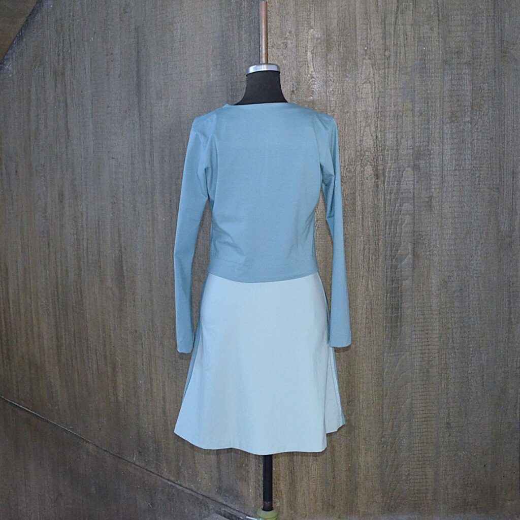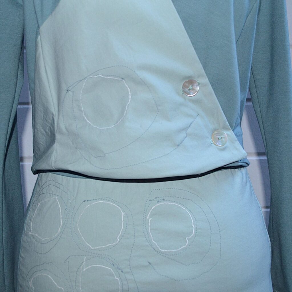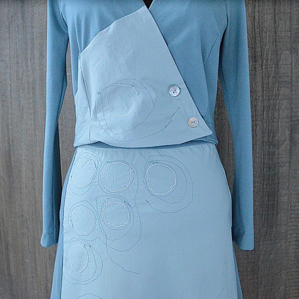6. November 2025 Outfit Nicoletta Das hellpetrolfarbene Outfit besteht aus einem A-Linien-Rock und einem kurzen Shirt in Wickeltechnik. Rock und Shirt sind kombiniert aus Baumwolljersey und einer feinen leicht elastischen Baumwollwebware (3% Elastan). Die Passform ist eng und figurbetont. Die Baumwollwebware wurde von Helma mit der Nähmaschine bestickt und gestaltet. Das Outfit ist im Oktober 2025 entstanden.
