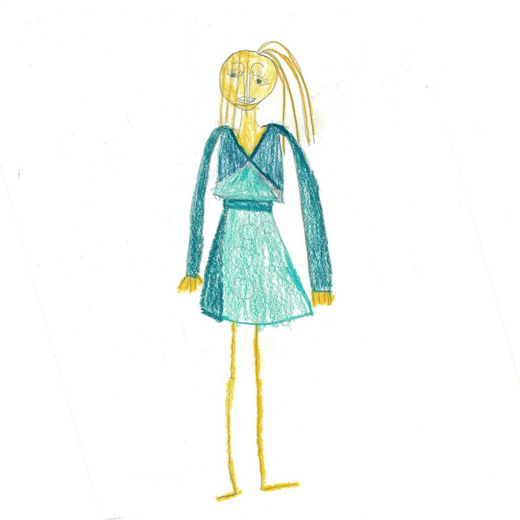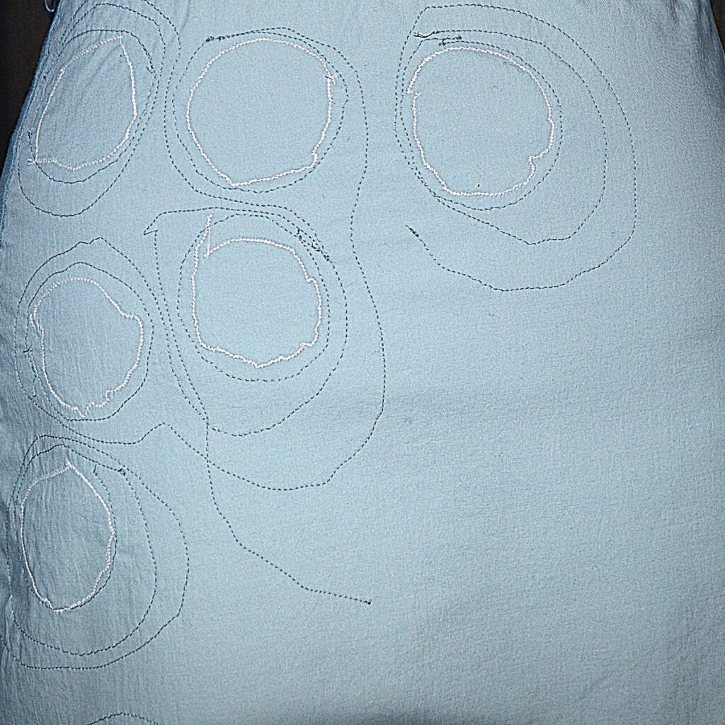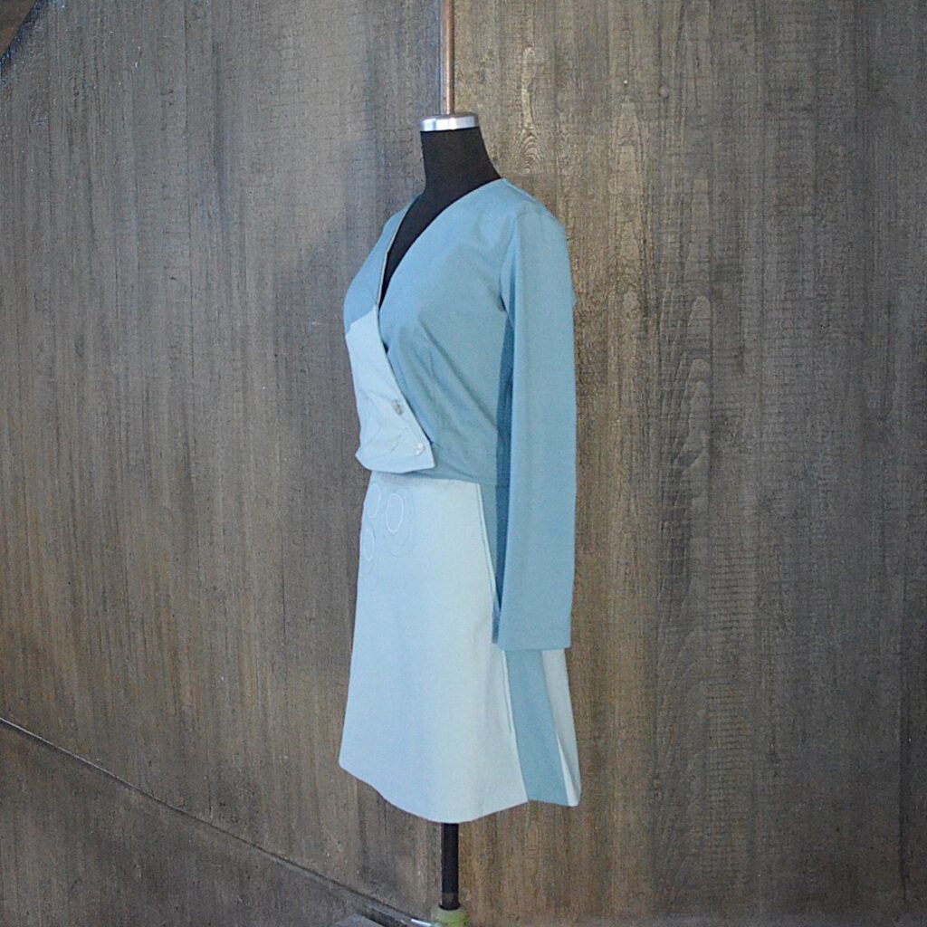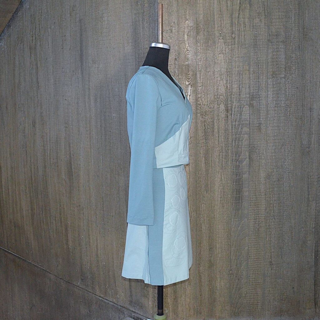 6. November 2025 Outfit Nicoletta Das hellpetrolfarbene Outfit besteht aus einem A-Linien-Rock und einem kurzen Shirt in Wickeltechnik. Rock und Shirt sind kombiniert aus Baumwolljersey und einer feinen leicht elastischen Baumwollwebware (3% Elastan). Die Passform ist eng und figurbetont. Die Baumwollwebware wurde von Helma mit der Nähmaschine bestickt und gestaltet. Das Outfit ist im Oktober 2025 entstanden.