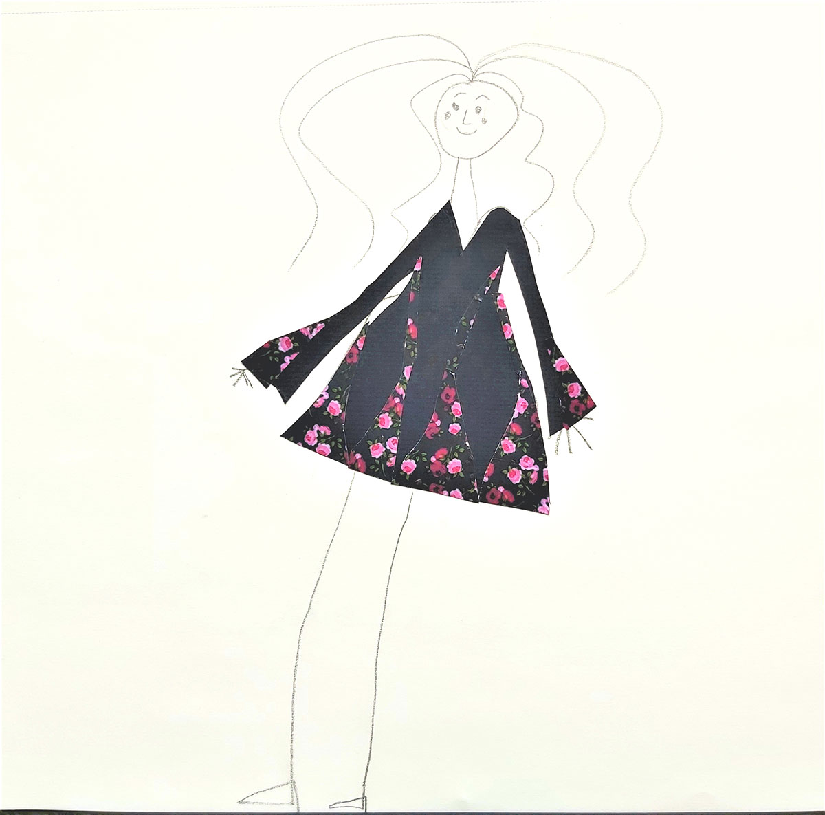 25. Mai 2021 Skaterkleid Kleid aus dunkelblauem Rippjersey und Röschen-mousselin. Ausgesteller Arm und Rock, V-Ausschnitt. Mai 2021